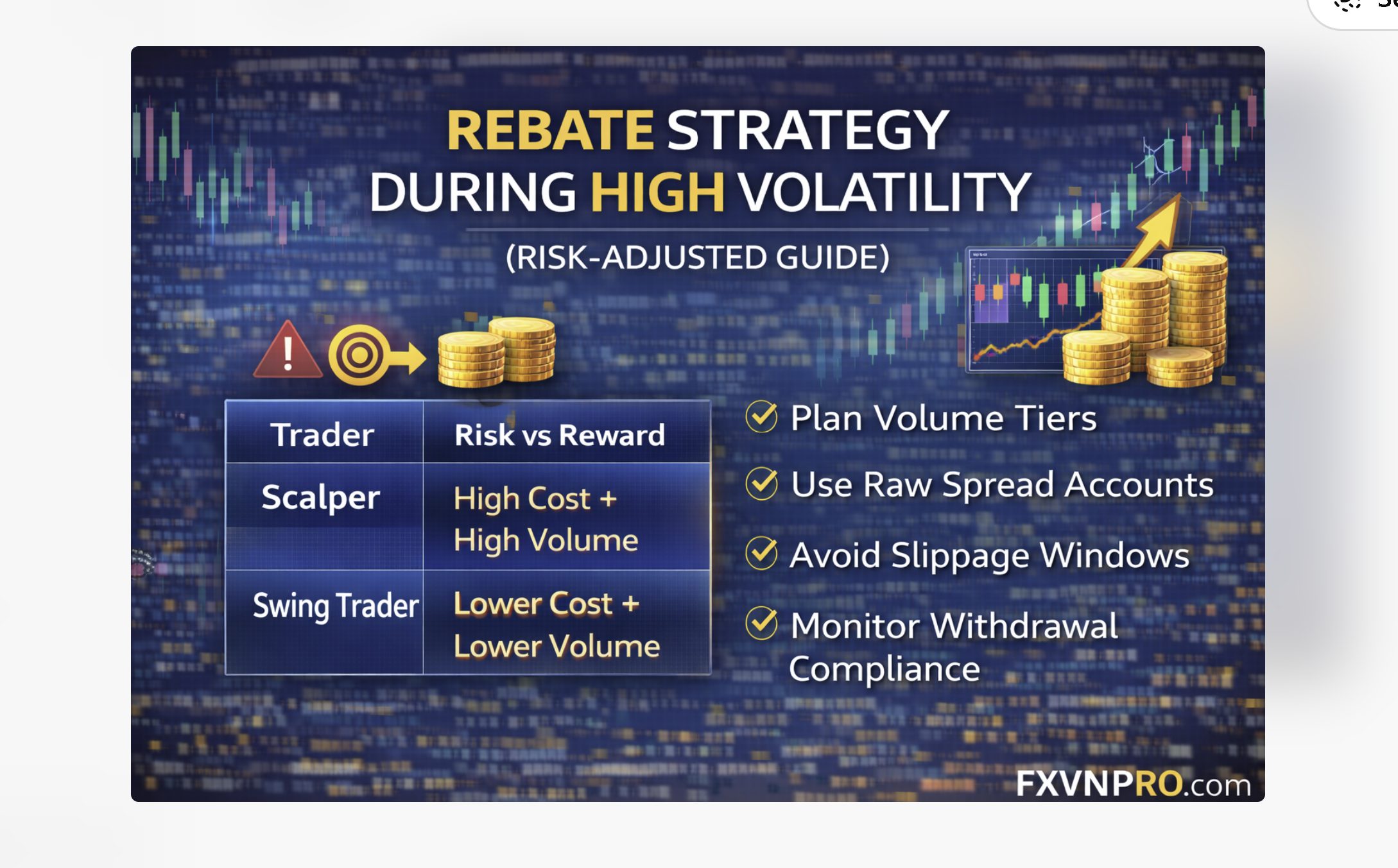 Rebates are volume-based. During volatile sessions (NFP, CPI, FOMC, geopolitical events):